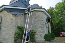 die Naumburger Jugendfeuerwehr bei der Reinigung der Dachrinnen bei der